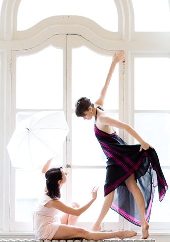The window light is heavenly, and the models are just like angels. They turned out going really well together. Even in a sunny day, the light inside the studio is dark, so a common urge is to use flash fill. With a flash fill, you can get a much crisp image, and “correct” color. The problem though, is that the highly directional light from flash kills the heavenly mood from the window light. I used flash last time with Saki with this same backdrop to get a dramatic mood as well as matching the exposure to the interesting building outside. This time however, I want a beautiful dream kind of mood. So flashes stayed in camera bag.