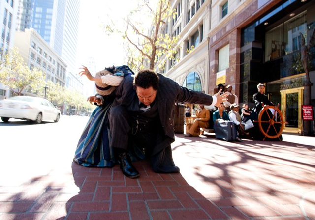 Last Saturday with Requisite Dancers at Embarcadero was a different experience.  I had at best a very vague idea what kind of photo I will take. I knew there is a spot where you can stand in the middle of the road and look down the whole Market street. Always wanted to see what kind of photo opportunity it can generate. So that became our first site. Girls caused many attractions from tourists. Many people asked them for their performance information. It seems taking dance photos on street can be a very good promotion tool.