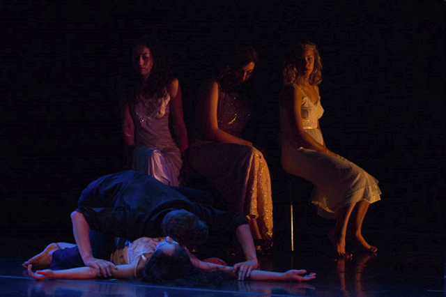 A group of people moving on stage,  with the music, and with one, and ONLY one girl dancing topless.