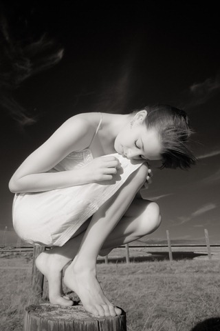 Like so many things in life, you have to look for the opposite to achieve a balance. In low key image, you look for strong light for drama, in high key images, you look for dark area and lines to define the image. Megan’s dark dress worked superbly in this lighting by providing an anchor to the images, so does Jackie’s hair color.